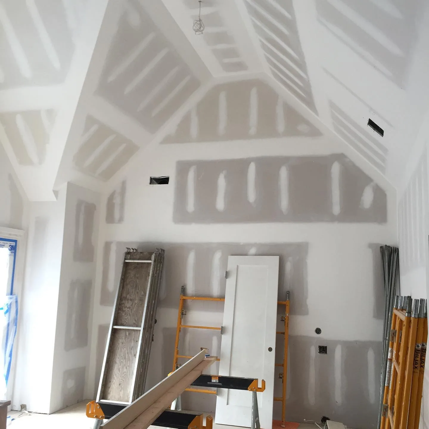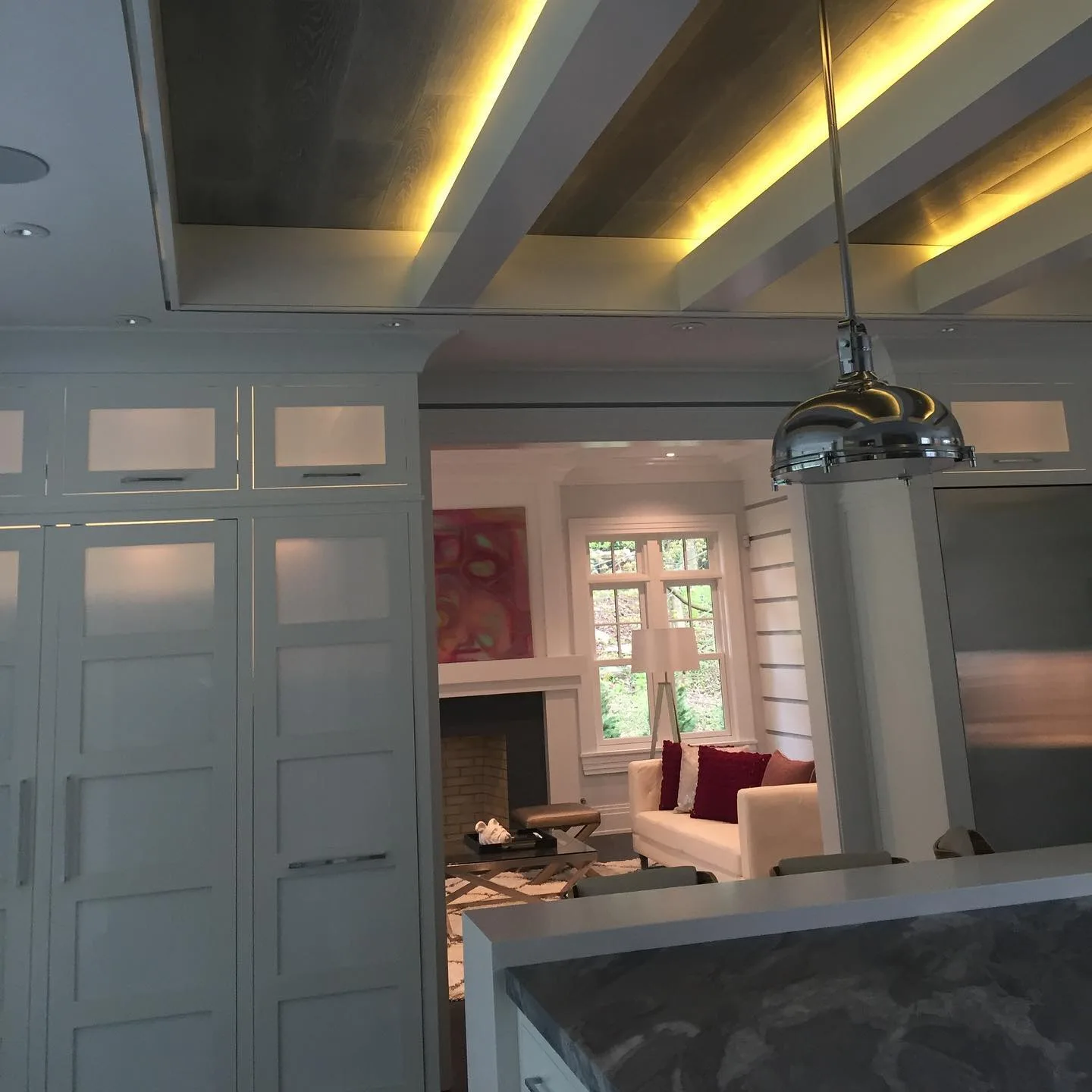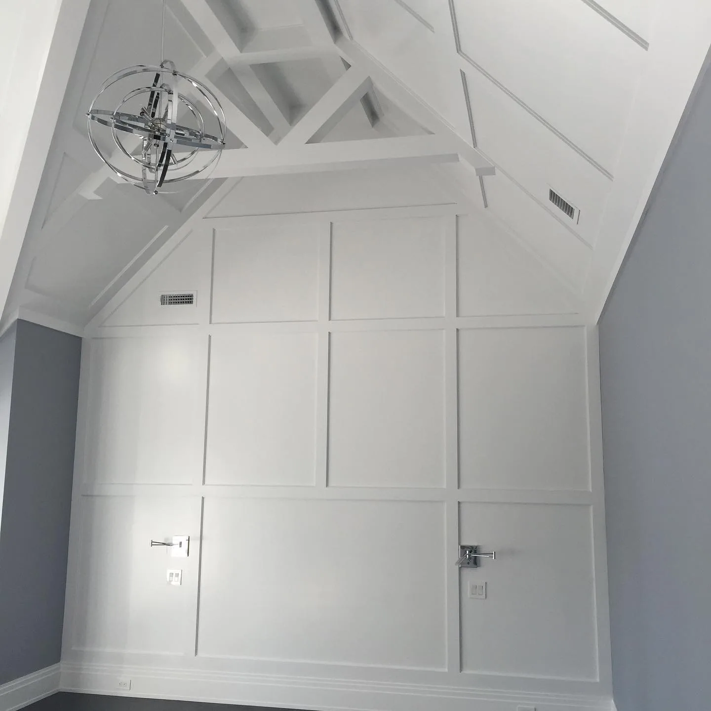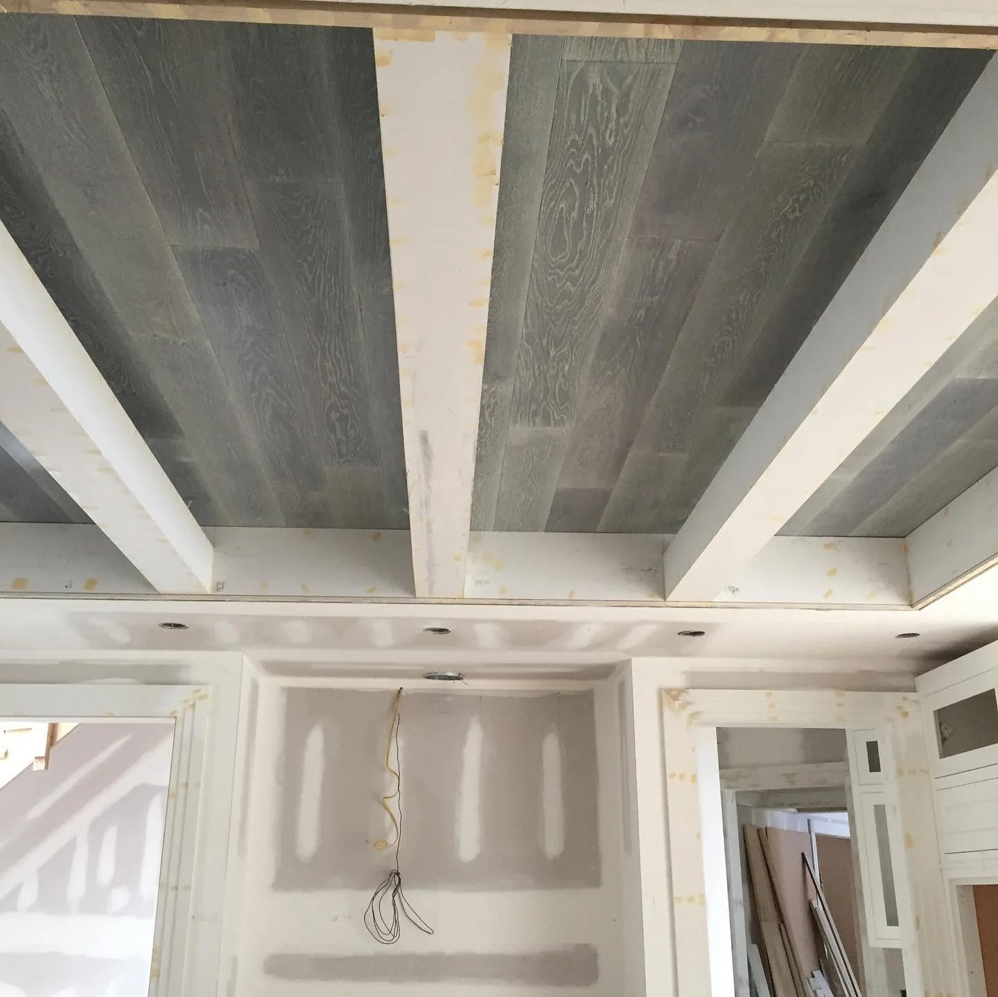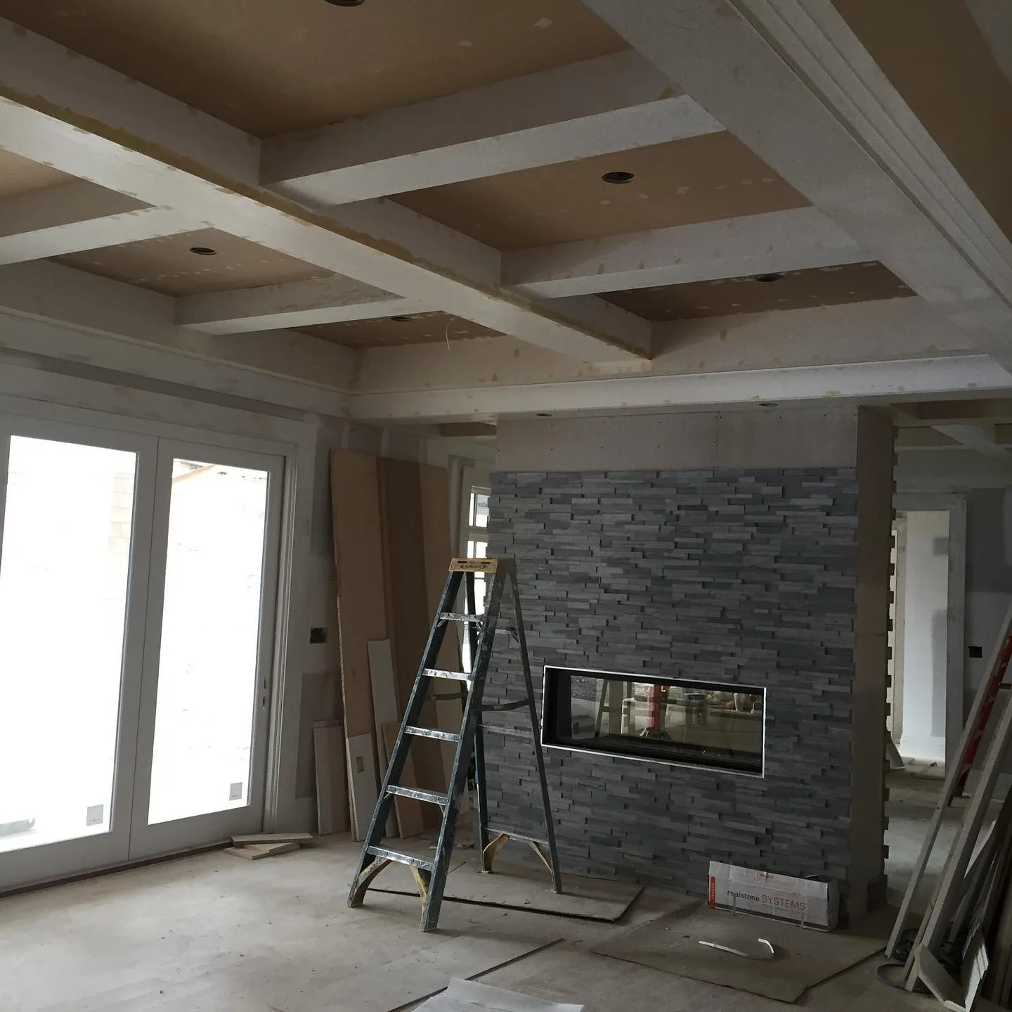 This project focused on installing intricate, custom ceilings throughout several large living areas. First, our team meticulously designed and built the detailed wood beam grids from scratch. This critical phase required a high level of precise finish carpentry. Subsequently, the ceilings received various finishes. We used a modern gray wood plank look in some areas, while other sections feature clean white V-groove planks. During the construction phase, we also installed a modern stacked stone fireplace and large built-in cabinetry. Recessed and cove lighting was then integrated to highlight the new architectural details. Ultimately, this addition completely redefined the luxury interior spaces.