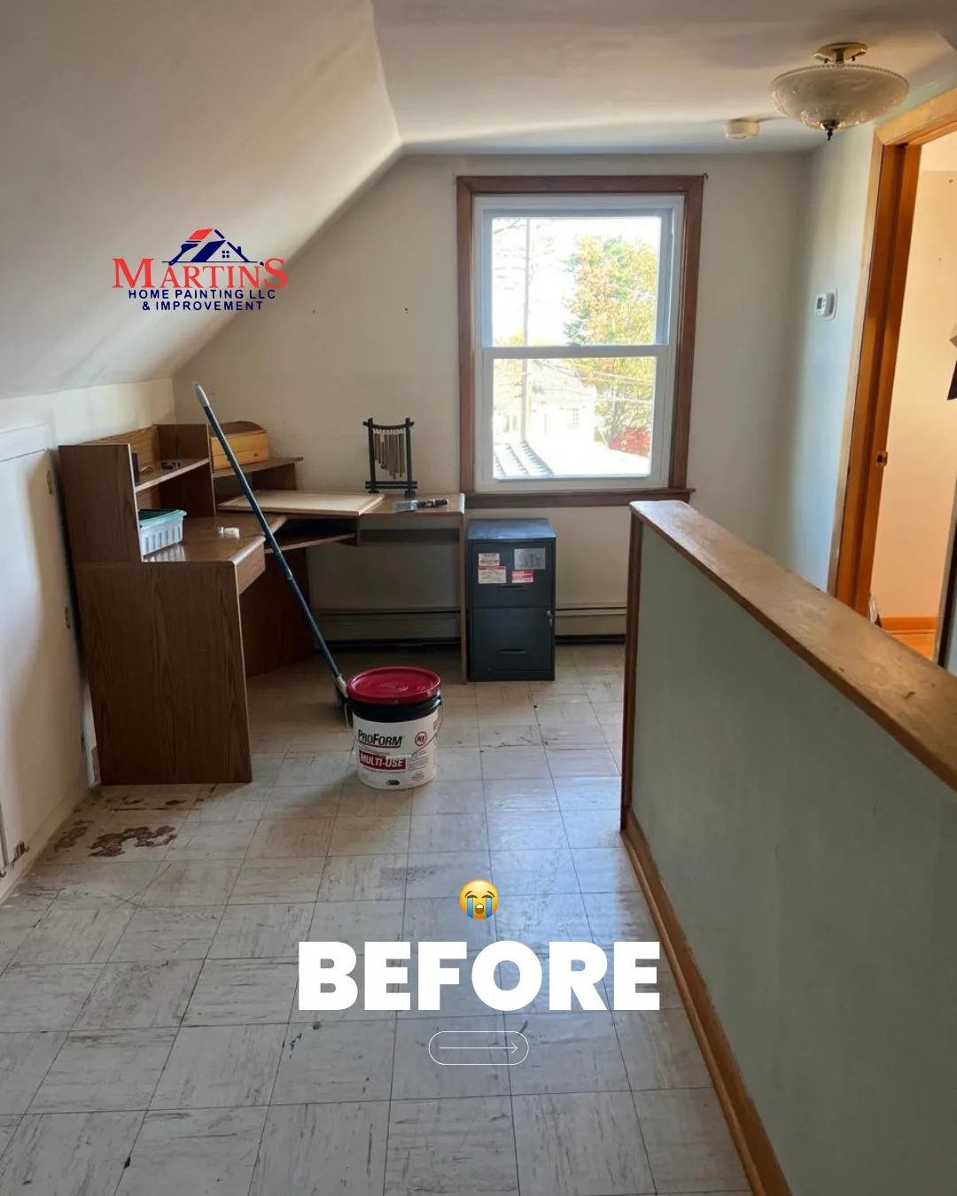 This project highlights a comprehensive interior renovation of a residential attic and hallway area. Initially, the space suffered from outdated finishes and worn-out tiling that made the room feel dark and neglected. Consequently, the team focused on stripping away the old materials to prepare for a modern upgrade. Furthermore, the wooden trim and walls were professionally painted to brighten the entire floor. In addition to the aesthetic wall updates, the installation of durable wood-grain flooring was completed to enhance the room’s functionality. Ultimately, this interior renovation successfully turned a cluttered storage area into a clean, cohesive, and inviting living space.
